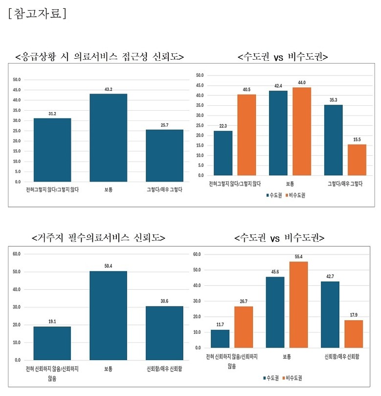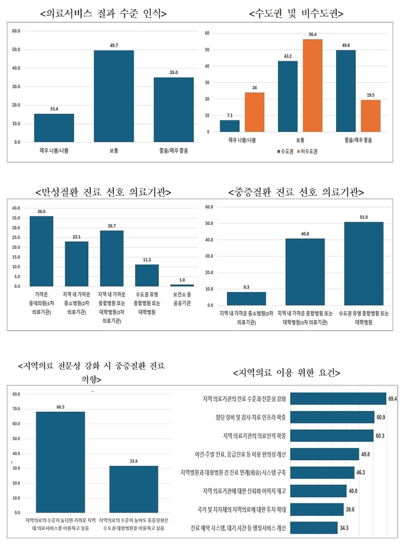 지역 필수의료 서비스에 대한 신뢰도 역시 30.6%에 그쳤으며, 비수도권 주민은 17.8%로 수도권(42.7%)의 절반에도 미치지 못했다. 지역의료 전반에 대한 만족도 또한 전체 35.0%, 비수도권은 19.5%로 매우 낮았다. 이러한 불신은 지방의 환자들이 수도권 대형병원으로 쏠리는 현상의 핵심 원인으로 지목된다.