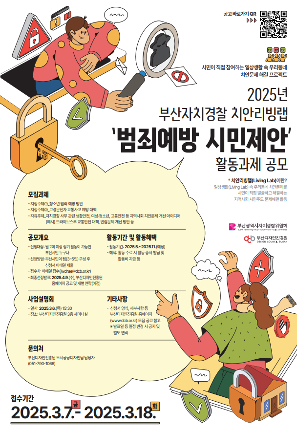 부산 거주 시민, 단체는 물론 부산경찰청(경찰서), 구·군, 부산소재 대학, 유관기관 등이면 누구나 신청 가능하며, 3~5인 팀으로 참여할 경우 과제 선정 시 우대된다. 3월 7일부터 18일까지 전자우편(jwchae@dcb.or.kr)으로 신청서류를 제출하면 된다.