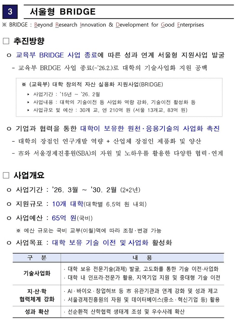 ○ (서울형 BRIDGE) 시 5대 전략사업분야(AI, 로봇, 핀테크, 바이오, 창조)에서 기업과 협력하여, 대학이 보유한 기술·특허 등 우수 연구성과를 최종 수요처인 기업이 원하는 기술 수준까지 고도화하고 기술이전 또는 기술창업까지 연계될 수 있도록 지원한다. 총 10개 대학, 대학별 연 6.5억 원을 지원(총 65억 원)한다. 사업기간은 기본 2년, 연장 2년이다.