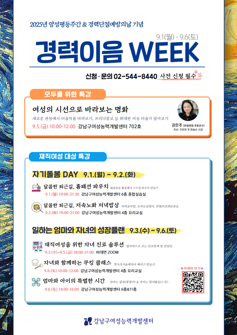 이와 함께, 강남구여성능력개발센터에서는 주민 누구나 즐길 수 있는 다양한 주간 프로그램을 운영한다. 9월 1일에는 퇴근길에 참여할 수 있는 ‘스트링 파우치 만들기’, 2일에는 ‘저속노화 샐러드·샌드위치 조리법’을 배워보는 시간이 마련된다. 3일부터 5일까지는 재직 여성을 대상으로 ‘명리학으로 보는 자녀 진로 솔루션’ 온라인 강좌가 열리며, 5일 오전에는 그림으로 성평등을 이해하는 특강을 진행한다. 주말인 6일에는 가족이 함께할 수 있는 프로그램이 눈길을 끈다. 오전에는 ‘자녀와 함께하는 쿠킹수업’에서 쫀득 쿠키와 캐릭터 케이크를 만들고, 오후에는 엄마는 꽃꽂이로 힐링을, 아이는 드론 만들기로 창의력을 키우는 ‘엄마와 아이의 특별한 시간’이 열린다.
