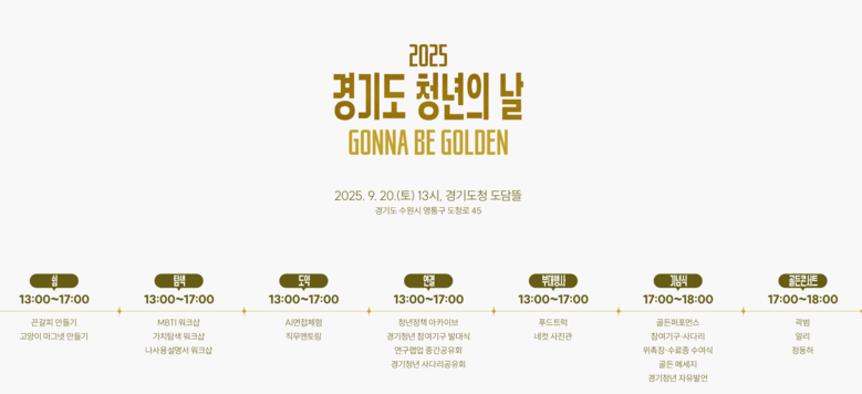 올해 슬로건은 “경기 청년 gonna be, Golden”으로, 청년을 응원하고 쉼·탐색·도전의 주인공으로 조명한다는 의미를 담았다.