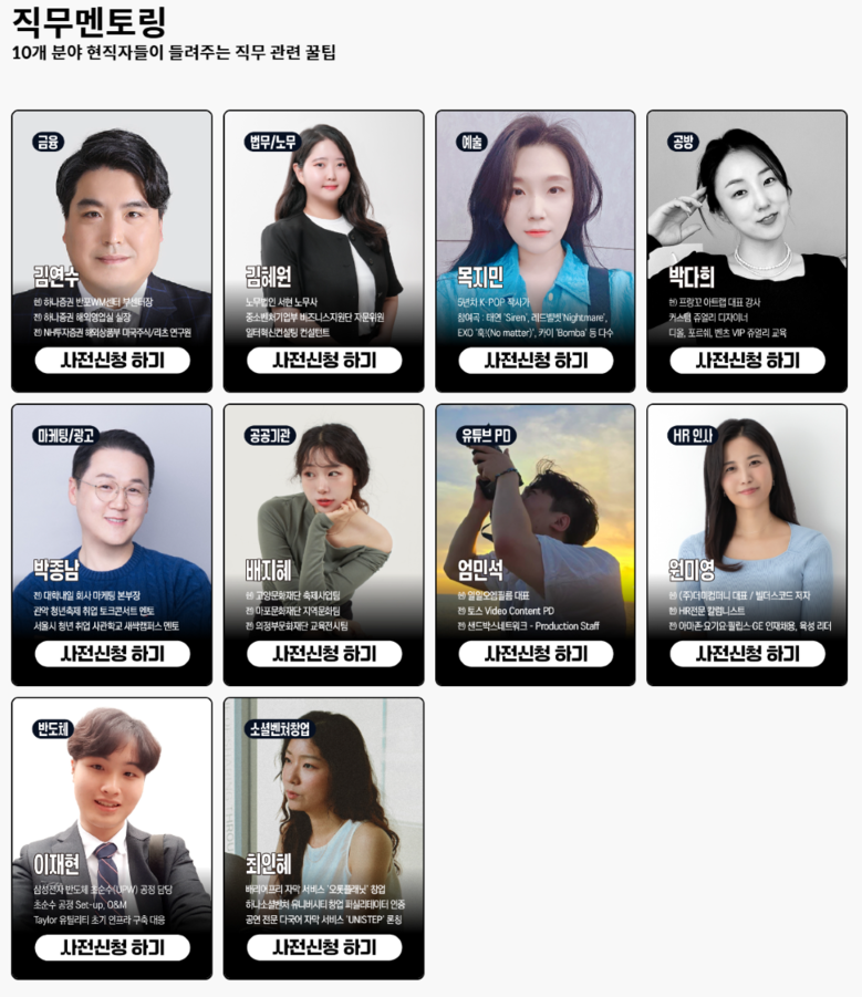 직무 멘토링 시간에는 금융, 법무/노무, 예술, 공방, 마케팅/광고, 공공기관, 유튜브PD, HR인사, 반도체, 소셜벤처 창업 등 10개 분야에서 활발히 활동하는 현식자들이 직무 관련 꿀팁을 전하고 청년들의 질문에 답할 예정이다.