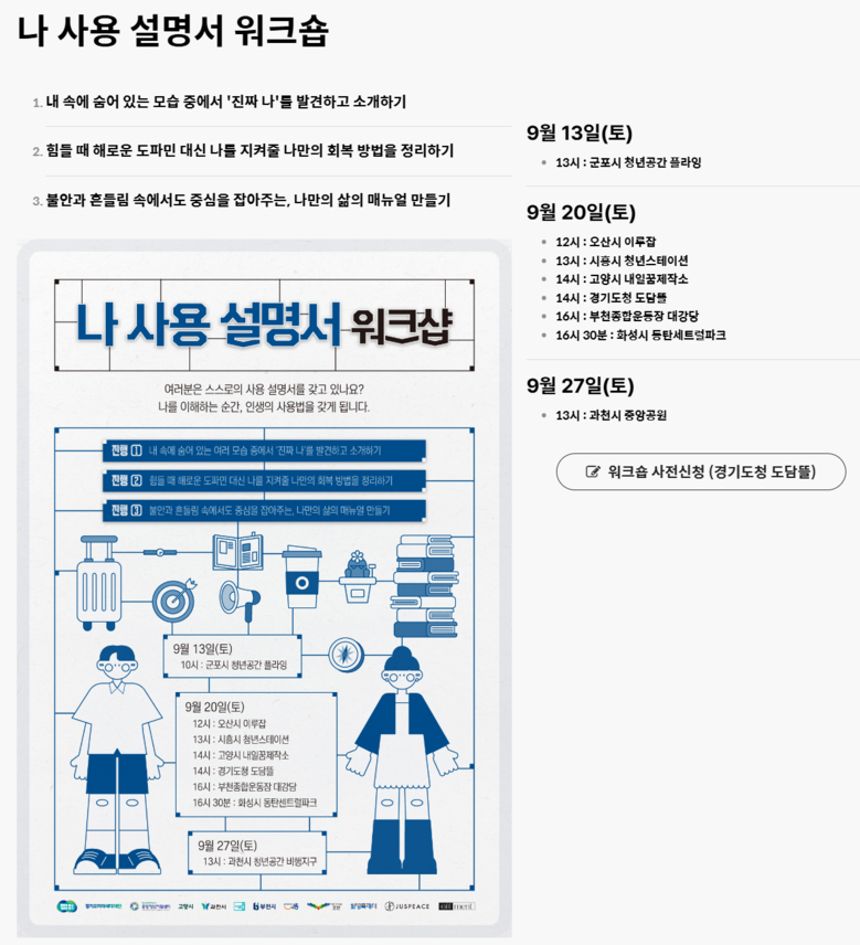 ‘나 사용 설명서 워크숍’은 경기도미래세대재단이 (재)저스피스재단, 중앙청년지원센터, 오프먼트와 협력해 기획한 청년의 날 공통 홍보 프로그램이다. 수원·군포·오산·시흥·고양·부천·화성·과천 등 8개 시군에서 연계 운영되며, 빠르게 변하는 사회에서 불안과 혼란을 겪을 청년들이 ‘진짜 나’를 찾고 중심을 잡을 수 있도록 여러 심리·체험 프로그램으로 구성됐다.