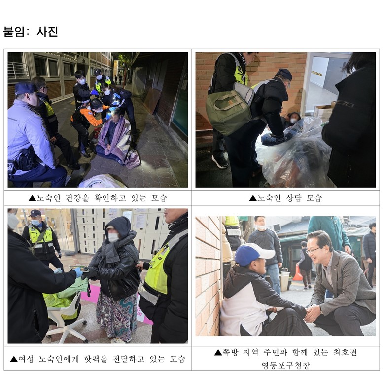 최호권 영등포구청장은 “민관 협력 체계를 바탕으로 취약계층을 보호하는 안전망을 구축할 것”이라며 “어느 한 분도 추위 속에서 위험에 놓이지 않도록 세심한 보호와 지원을 이어가겠다”라고 전했다.