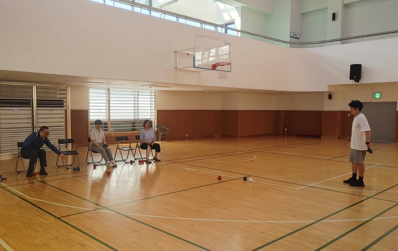 | ▲ 보치아 스포츠교실에서 공을 굴려 표적구에 가까이 가는 연습을 하고 있다. |