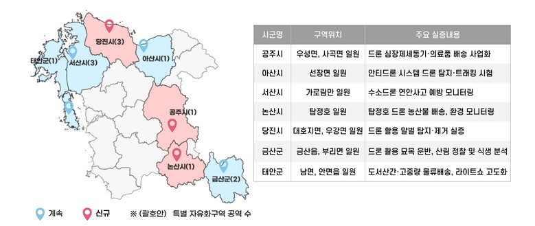 이로써 도내에는 기존에 지정된 아산·서산·금산·태안 등 4개 시군 7개 구역을 포함해 드론특별자유화구역이 총 7개 시군 12개 구역으로 늘었다.