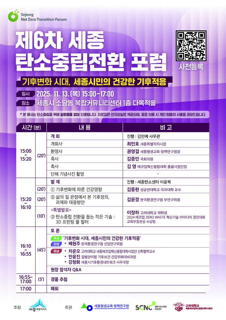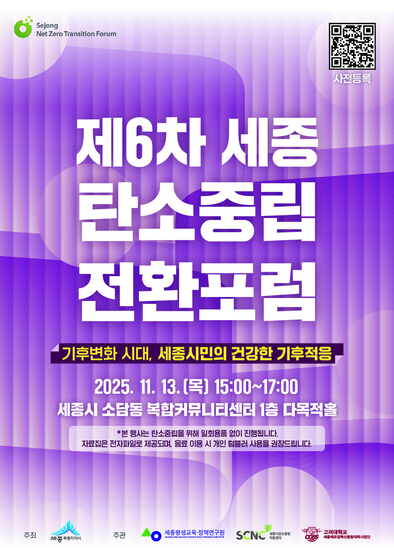 이번 포럼은 세종시, 세종평생교육‧정책연구원, 세종시탄소중립지원센터, 고려대(세종캠퍼스) 에코업혁신융합대학사업단이 공동주최한다.