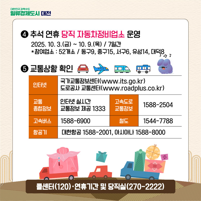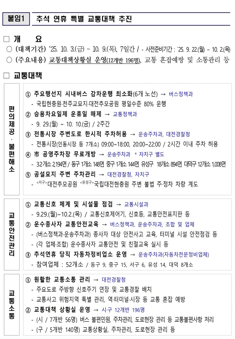 장거리 운행 중 고장에 대비해 동구·중구·서구·유성구·대덕구에서 총 52개 당직 자동차정비업소가 운영되며, 운수종사자를 대상으로 한 교통안전·친절교육과 교통시설물 사전 점검도 이미 완료됐다.