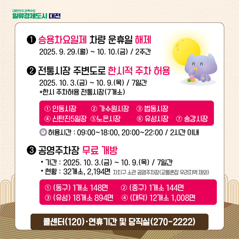 시와 자치구 공영주차장 32곳(2,194면)은 연휴 기간 무료 개방되며, 인동시장 등 7개 전통시장 주변 도로는 한시적으로 2시간 이내 주차가 허용된다. 승용차요일제는 9월 29일부터 10월 10일까지 2주간 운휴를 해제해 이동 편의를 도모한다.