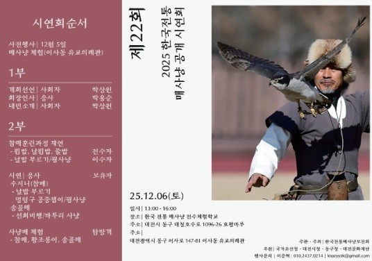 전일홍 대전시 문화예술관광국장은 “매사냥은 인간과 자연이 함께 어우러지는 전통 기술로, 조상들의 생태적 지혜와 자연을 향한 깊은 경외심이 스며있다”라며, “시민들이 이 귀중한 전통을 체험하고 인간과 자연과의 교감을 만끽하시길 바란다”라고 전했다.