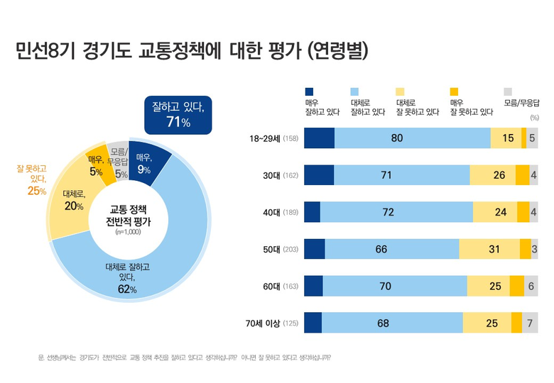 경기도는 지난 4월 25일부터 28일까지 도민 1,000명을 대상으로 실시한 여론조사에서 민선8기 교통정책에 대해 71%가 ‘잘하고 있다’고 응답했다고 28일 밝혔다. 부정평가는 25%에 그쳤다.