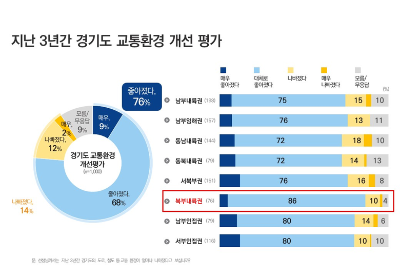 현재 교통환경에 대해서는 응답자의 61%가 ‘좋다’고 평가했으며, 최근 3년간 교통환경이 ‘좋아졌다’고 응답한 비율은 76%에 달했다. 특히 북부내륙권(의정부·양주·동두천·포천·연천)의 경우 현재 만족도는 46%로 상대적으로 낮았지만, 최근 3년간 교통환경이 개선됐다는 응답이 86%로 높게 나타나 도민들이 정책 효과를 체감하고 있는 것으로 분석됐다.