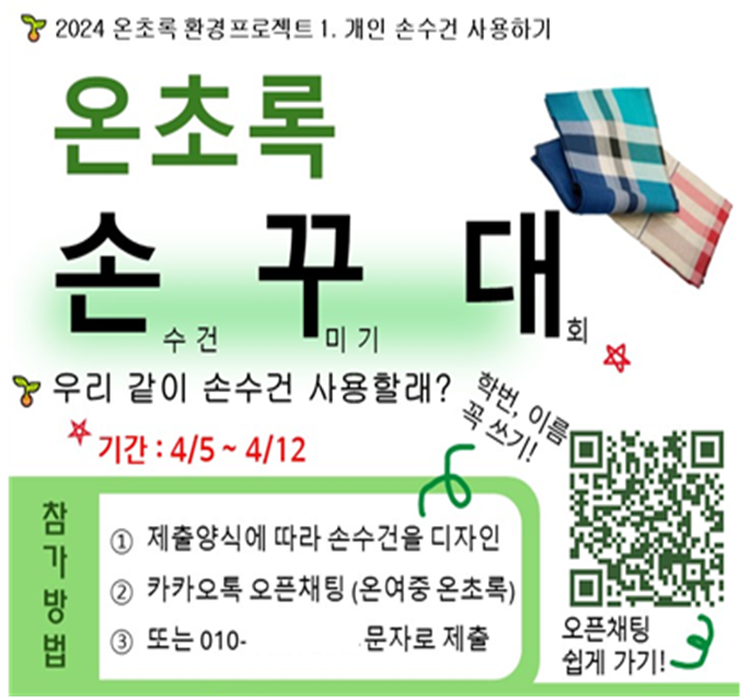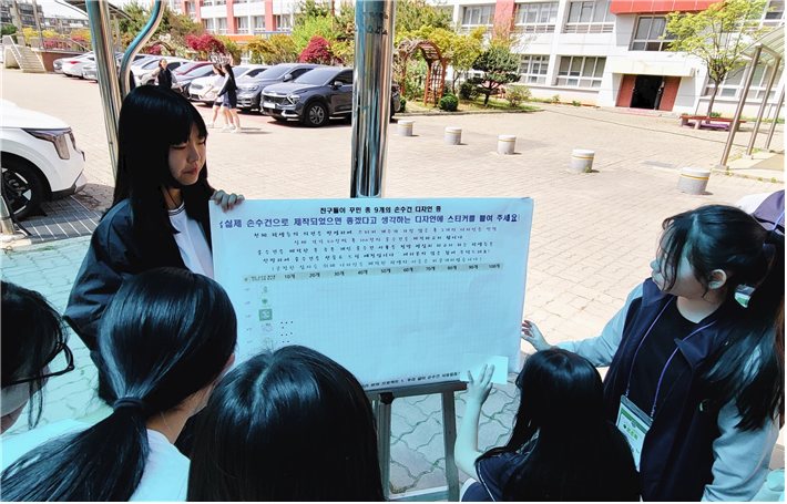 점심시간에 손수건 제작 최종 디자인 선발을 위해 전교생 투표가 진행되었고, 최종적으로 3학년 남O솔, 이O리 학생들의 작품이 선정되었다. 최종 선발된 디자인으로 손수건은 실제 50장씩 총 100장이 제작되었고 현재 전교생을 대상으로 손수건 사용단을 모집 중이다. 이후 손수건 사용단 친구들의 한 달 사용 후기 등을 받아 공유함으로써 다른 학생들도 개인 손수건 사용하기에 적극 참여할 수 있도록 진행할 예정이다.
