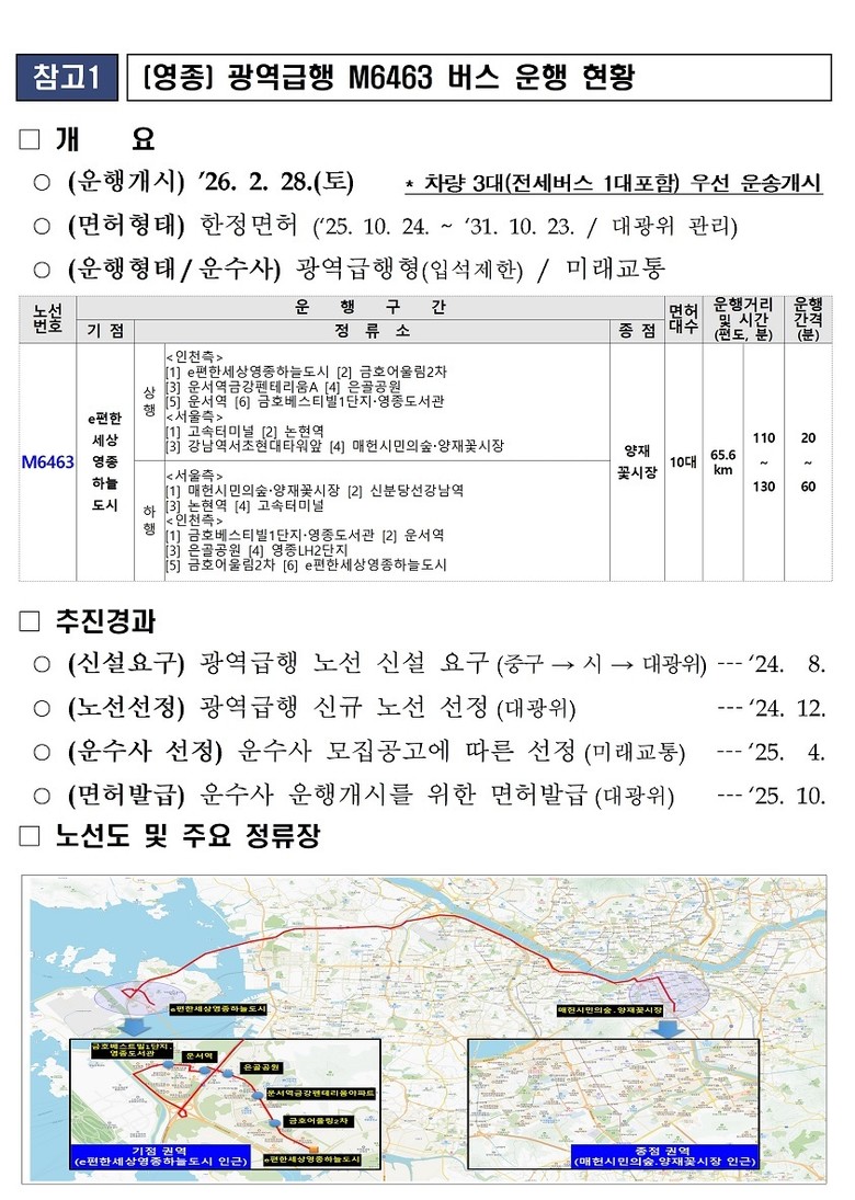 장철배 시 교통국장은 “M6462번에 이어 M6463번 운행으로 영종지역 광역교통망이 한층 강화되고 서울 접근성이 더욱 개선될 것으로 기대한다”며, “운행 초기 안전하고 안정적인 운영이 이루어질 수 있도록 지속적 관리해 시민들이 편리하게 이용할 수 있도록 하겠다”라고 말했다.