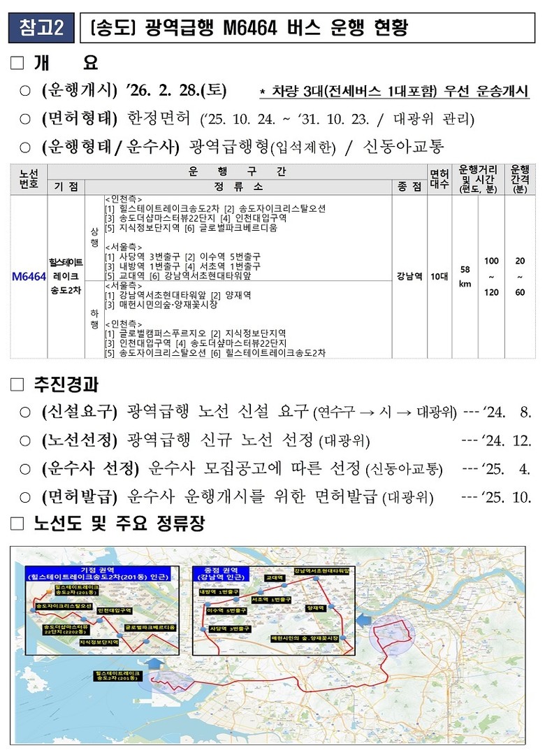 한편, 송도6공구와 강남역을 연결하는 광역급행버스 M6464번 노선도도 2월 28일부터 함께 운행을 시작한다.