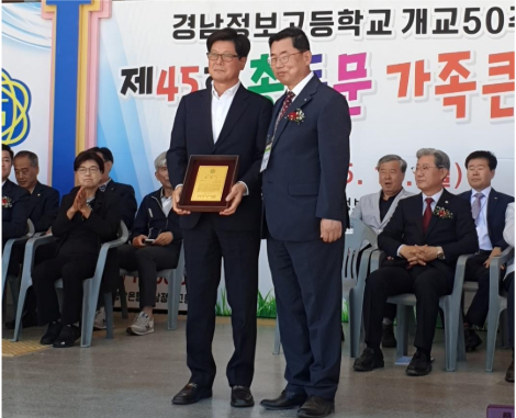 이날 장정식 회장은 2024년에도 1,000만원을 쾌척하여 모교에 대한 사랑의 실천을 이어가고 있다. 그는 2000년 모교 축구부의 후원 회장을 역임한이후 꾸준한 모교사랑을 실천해온 결과 올해 개교 50주년 동문행사에서 그 동안의 공을 인정받아 자랑스러운 “진상인의 상”을 수상 하기에 이르렀다.