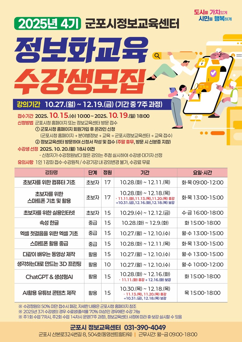 수강신청은 2025년 10월 15일(수) 오전 10시부터 10월 19일(일) 오후 6시까지 가능하며, 군포시청 홈페이지 또는 군포시 정보교육센터(산본로324번길 8, 504호, 주말 휴무) 방문을 통해 신청할 수 있다.
