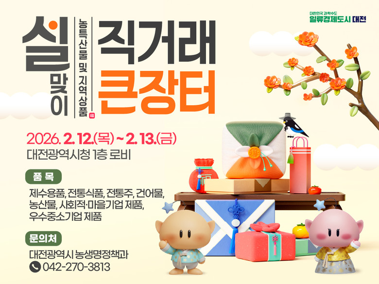 - 시와 인접한 6개 시군 참여… 도시와 농촌 상생 의미 더해 - [대전 세계타임즈=이채봉 기자] 대전광역시는 다가오는 설 명절을 맞아 시민들의 장바구니 부담을 덜고 지역 농가의 판로를 지원하기 위해 오는 2월 12일부터 13일까지 이틀간 시청 1층 로비에서 ‘설맞이 우수 농·특산물 및 지역상품 직거래 장터’를 개최한다.