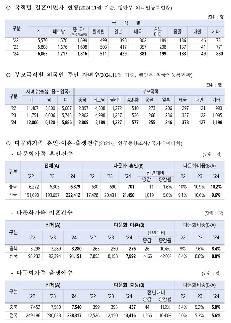 이 같은 증가세는 결혼이민자 가정의 안정적인 정착과 지역사회 기반 확립을 보여주는 지표로 해석된다. 특히 청주·진천·음성 등 산업단지와 교육 인프라가 밀집한 지역을 중심으로 가족 단위의 정착형 다문화가정이 꾸준히 늘고 있는 것으로 나타났다.
