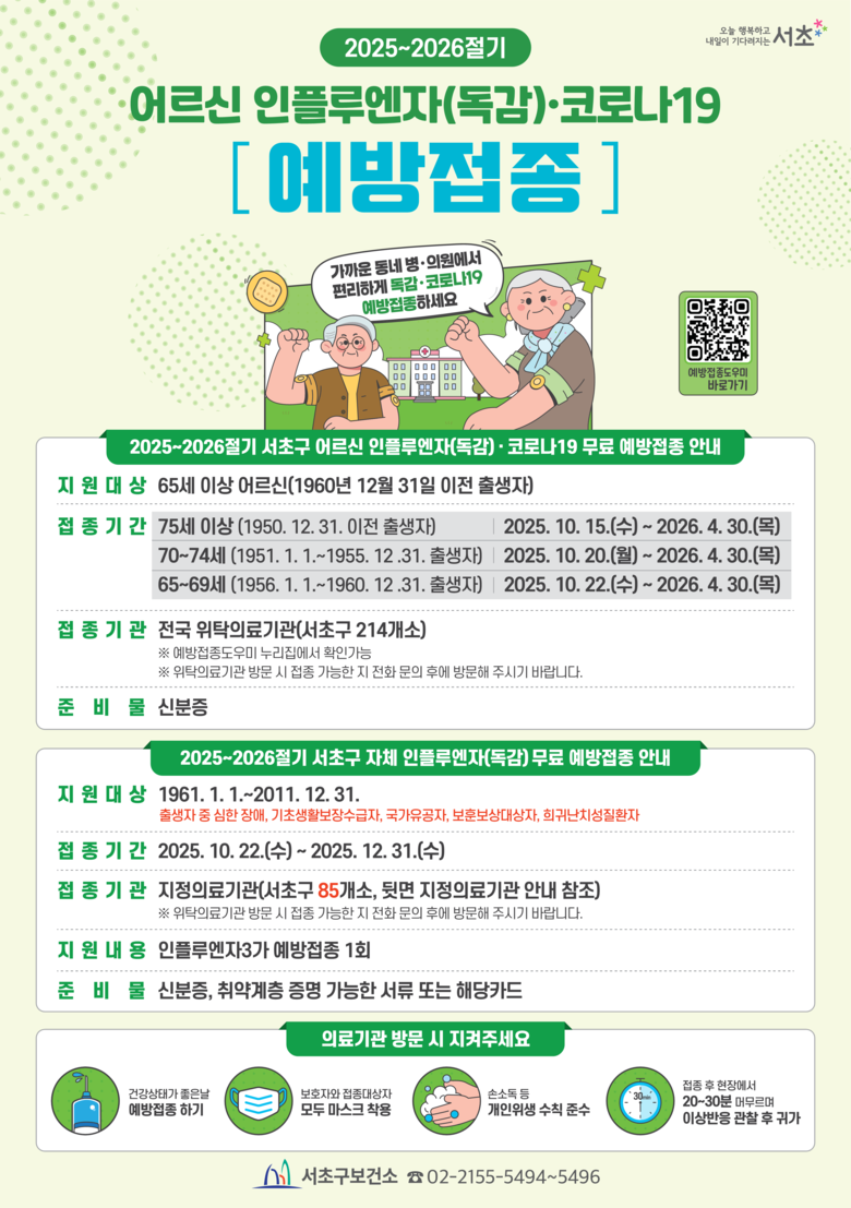 무료 예방접종 대상은 ▲생후 6개월~13세 어린이(‘12.1.1.~’25.8.31. 출생자) ▲임신부 ▲1961.1.1.~2011.12.31. 출생자 중 중증 장애인, 기초생활수급자, 국가유공자 ▲65세 이상 어르신(‘60.12.31. 이전 출생자)인 서초구민으로 대상과 연령별 접종 시작일을 분리해 순차적으로 시행한다.