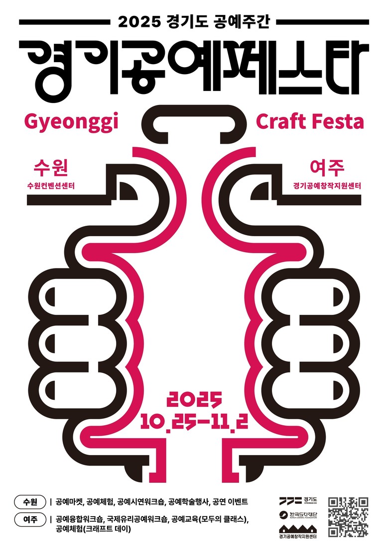 한편 10월 25일 수원컨벤션센터 야외광장에서는 ‘2025 경기도 공예주간-경기공예페스타’ 개막식이 열린다. 개막식은 무대 제막식을 시작으로 경기공예페스타에 참여한 공예마켓·워크숍·체험 부스 소개, 가족 음악극 ‘음악당 달다, 랄랄라 패밀리쇼’로 기념 공연이 이어지며 축제의 시작을 알릴 예정이다.