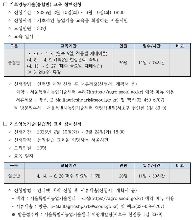 이번 교육은 ▴전원생활교육 ▴기초영농기술교육(종합반) ▴기초영농기술교육(실습반)으로 구성되며, 서울 시민이면 누구나 신청할 수 있다.