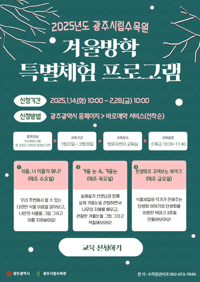 이정신 광주수목원·정원사업소장은 “겨울방학 프로그램을 통해 아이들이 가족과 함께 의미 있는 시간을 보내길 바란다”며 “시민의 교육 및 문화 욕구를 충족시키기 위해 다양한 프로그램을 지속적으로 제공하겠다”고 말했다.