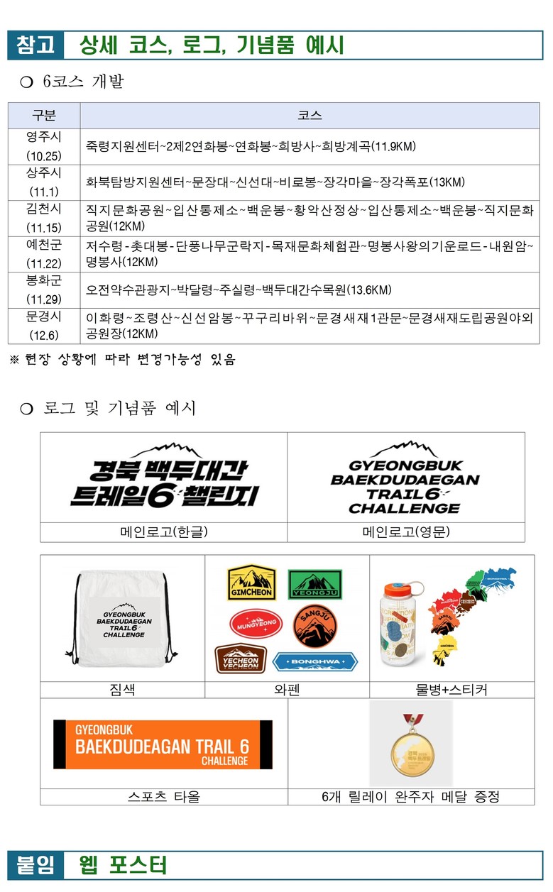 백두대간 산림관광의 대표 브랜드화를 위한 핵심 콘텐츠인 ‘경북 백두대간 트레일6 챌린지’는 6개 시군을 순회하며 총 6회에 걸쳐 총1,200명 규모로 운영된다.