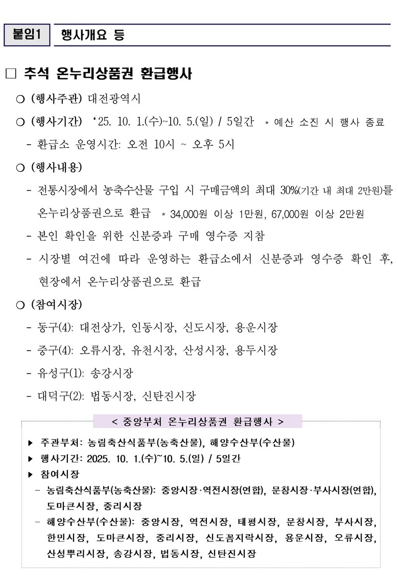 이번 행사는 농림축산식품부·해양수산부가 주관하는 전국 환급행사와 연계해 추진되며, 대전시민이 더 많은 혜택을 체감할 수 있도록 지역 전통시장에서 별도 운영된다.