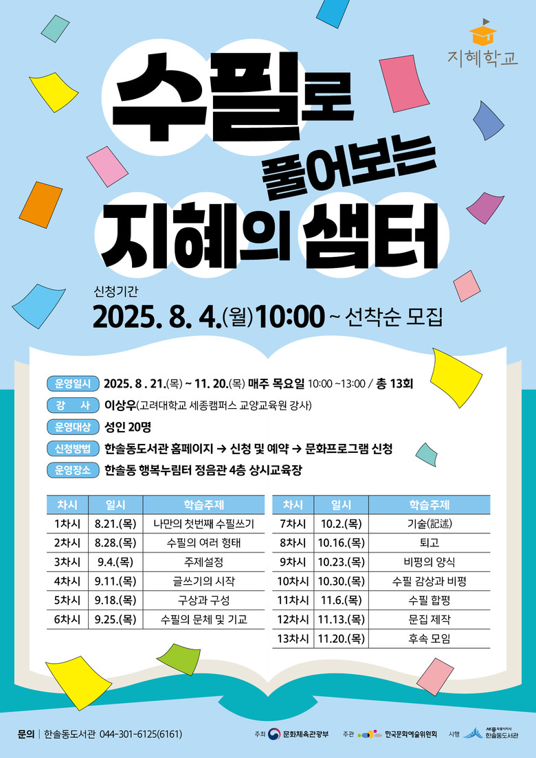 - 문체부 지원 '지혜학교' 운영기관 선정, 8월 4일부터 신청 접수 - [세종 세계타임즈=이채봉 기자] 세종시 한솔동도서관이 오는 4일부터 성인을 위한 인문학 글쓰기 강좌 ‘수필로 풀어보는 지혜의 샘터’의 참여자를 모집한다.