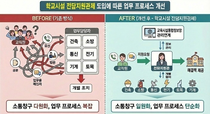 이번 제도는 도내 공립 단설유치원과 초.중.고등학교, 특수학교 등 총 774개 학교를 대상으로 운영되며, 22개 교육지원청 소속 기술직 공무원 123명이 전담지원관으로 참여해 학교별 맞춤형 지원이 이뤄질 예정이다.