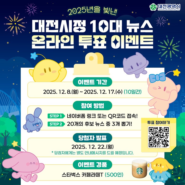 최우경 대전시 대변인은 “올해 대전은 다양한 성과를 거뒀다”라며, “2025년 대전시정을 되돌아보며 성과를 한눈에 알 수 있는 이번 투표에 많이 참여해 주시길 바란다”라고 말했다.