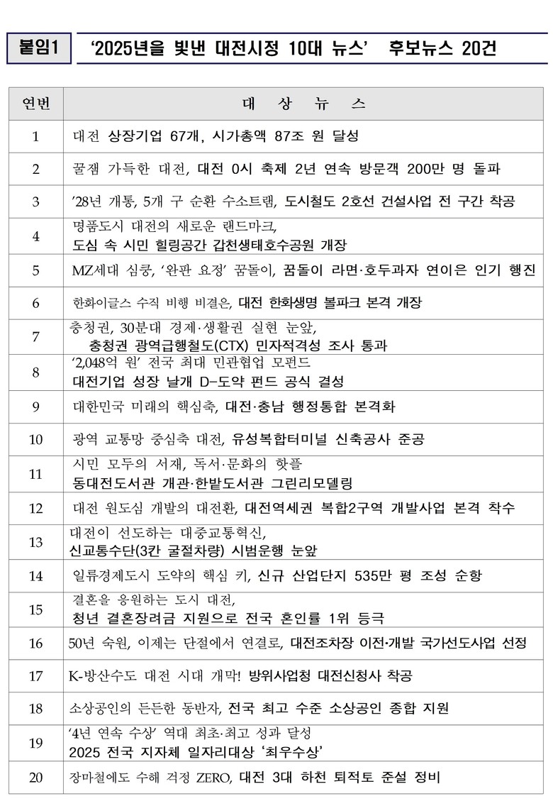 투표 대상은‘대전 상장기업 67개, 시가총액 87조 원 달성’,‘2년 연속 방문객 2백만 명 돌파한 대전 0시 축제’, ‘’28년 개통 목표, 대전 도시철도 2호선 사업 본격화’,‘새로운 랜드마크, 갑천생태호수공원 개장’ 등 20건의 후보 뉴스다.