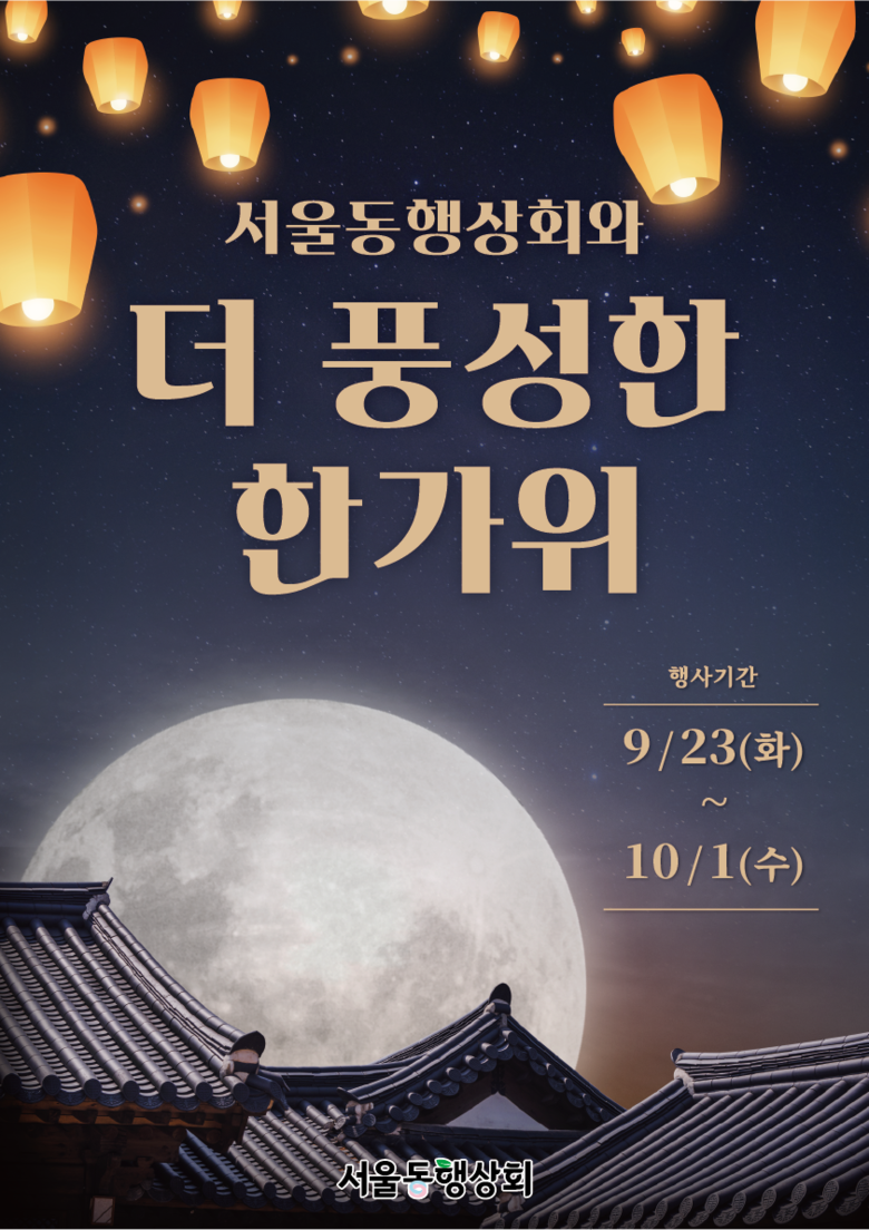 [서울 세계타임즈=이장성 기자] 서울시는 추석을 맞아 시민 장바구니 부담을 줄이고 지역경제와의 상생을 도모하기위해 9월 23일(화)부터 10월 1일(수)까지 서울 동행상회(종로구 율곡로 39, 안국빌딩 1층)에서 ‘서울동행상회와 함께하는 더 풍성한 한가위’ 특별전을 열고, 전국 우수 농·수·특산물과 추석 선물세트를 온·오프라인에서 최대 30% 특가로 선보인다.