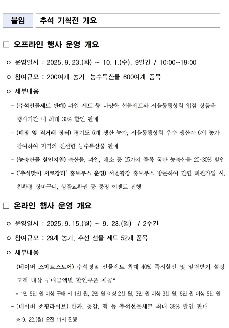 9월 29일~10월 1일에는 서울동행상회 입점업체들이 직접 참여하는 '생산자 직판매'가 진행되며, 시식 행사뿐만 아니라 김, 굴비, 송편, 제철과일 등 명절 상차림에 빠질 수 없는 먹거리를 최대 20% 할인된 가격에 판매한다.