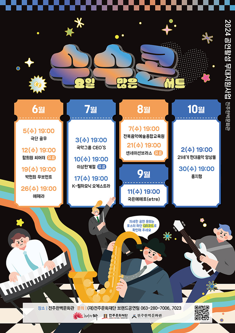 [전주한벽문화관=세계타임즈 이상호 기자] 전주한벽문화관(관장 김철민)은 ‘2024 공연활성 무대지원사업 <수요일 수많은 콘서트>’에 12개 단체를 선정했다. 지난해 10개 단체(5장르)를 지원했던 것에 비해 12개 단체(7장르)로 확대하여 전주 문화예술인·단체의 실연기회를 확대하는 동시에 공연장의 활성화를 꾀한다.