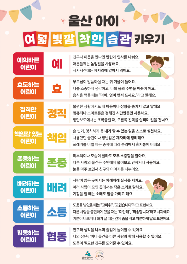 울산시는 「인성교육진흥법」에 명시된 핵심가치 8대 인성 덕목을 바탕으로 제작한 포스터와 인성카드 등을 관내 모든 어린이집에 배포해 영유아가 매일 10분씩 인성덕목을 익히고 일상생활에서 실천할 수 있도록 활용 방안을 마련했다.