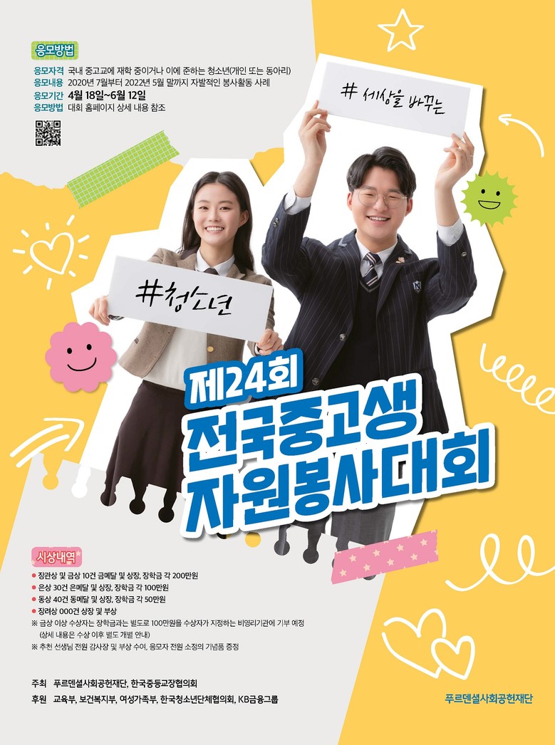 한편, 국내 최대 규모의 청소년 자원봉사 대회 ‘전국중고생자원봉사대회’는 1999년 처음 개최된 이래로 23년간 14만 명이 넘는 청소년이 응모해 3만 5천여 명이 수상의 영예를 안았다. 지난해에는 지역사회개발, 지도 활동, 환경보존 활동 등을 주제로 1,440명이 참가했으며, 이 중 창의적이고 진정성 있는 생각과 용기를 실천한 625명이 우수자원봉사자로 선정됐다.