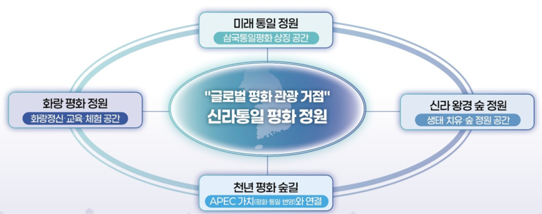 미래 통일 정원, 화랑 평화 정원, 신라 왕경 숲 정원, 천년 평화 숲길 조성이 주 사업으로 국비 160억 원을 포함한 320억 원 규모의 사업비 투입이 필요하다.