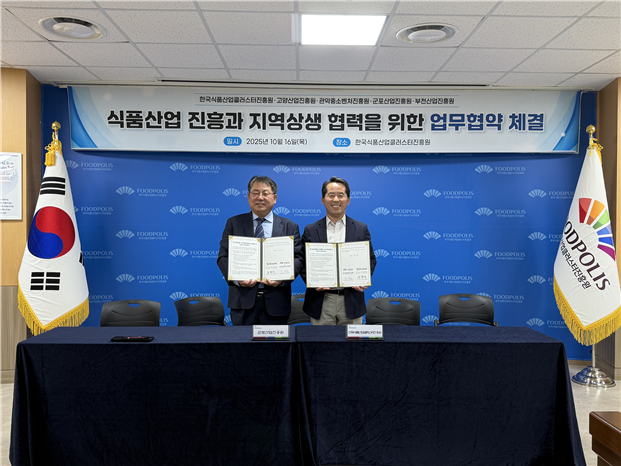 [군포시 세계타임즈=송민수 기자] 군포산업진흥원(원장 유병직)은 10월 16일 한국식품산업클러스터진흥원(이사장 김덕호)과 군포시 식품산업 발전과 식품 제조·가공 기업 육성과 경쟁력 강화를 위한 업무협약(MOU)을 체결했다고 밝혔다.
