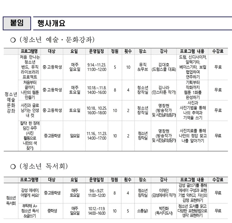 운영 프로그램은 ▲처음 만나는 청소년 밴드, 뮤직라이브러리 ▲처음부터 끝까지, 나만의 웹툰 만들기 ▲ 사진과 글로 남기는 인생 내 컷 ▲ 찰칵! 한장에 담긴 우주 ▲ 감성에세이, 어떻게 써요? ▲ 부탁해 A+ 청소년 독서&쓰기 등이다.