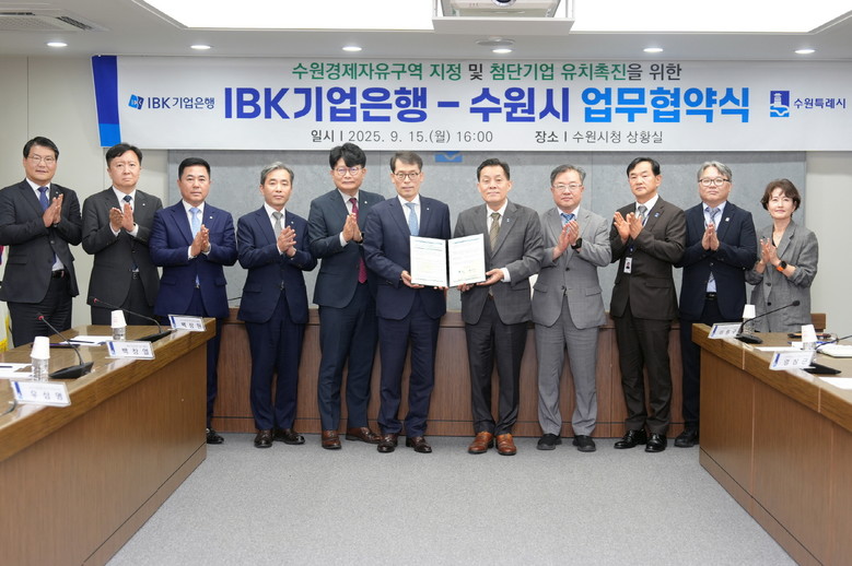 수원시와 IBK기업은행은 15일 시청 상황실에서 ‘수원 경제자유구역 지정, 첨단기업 유치 촉진을 위한 상생발전 업무협약’을 체결하고, 협력을 약속했다. 협약식에는 이재준 수원시장, 김성태 IBK기업은행 은행장 등이 참석했다.