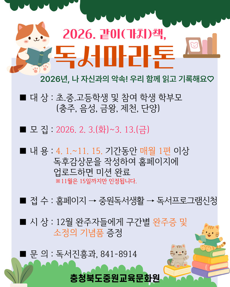 참여를 희망하는 학생은 중원교육문화원 누리집(www.jwec.go.kr)에서 신청할 수 있으며, 기타 문의 사항은 독서진흥과(☎043-841-8914)로 문의하면 된다.
