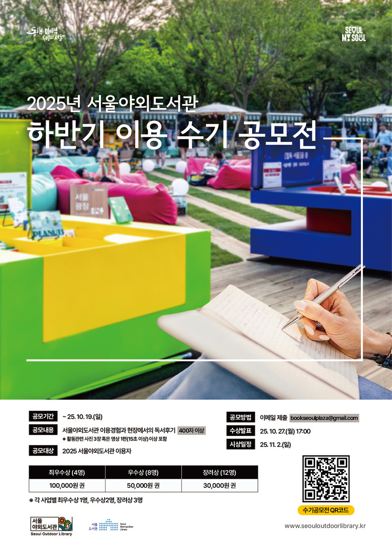 수상작은 이후 카드뉴스 등 디지털콘텐츠로 제작돼 서울야외도서관 누리소통망 채널을 통해 더 많은 시민들과 공유한다. 공모전과 관련된 자세한 내용은 서울야외도서관 누리집(seouloutdoorlibrary.kr)과 인스타그램(@seouloutdoorlibrary.s)에서 확인하면 된다.