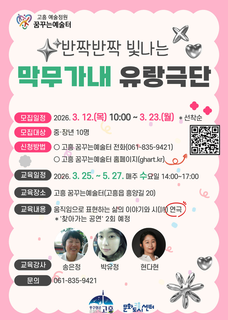 참가 신청은 3월 12일부터 고흥 꿈꾸는예술터 홈페이지(ghart.kr) 또는 전화(061-835-9421)로 할 수 있으며, 고흥군에 거주하는 중장년층이라면 누구나 참여 가능하다.