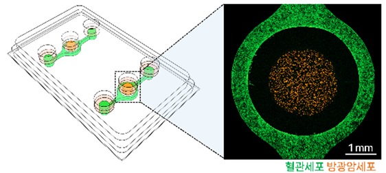 이에 이상철⦁전성윤 교수팀은 암세포와 혈관세포를 3차원으로 공동배양 할 수 있는 상부개방형 생체칩을 개발했다. 이 시스템은 혈관세포로 뒤덮인 생체칩을 이용해 약물과 영양소가 혈관을 통해 전달되는 과정을 관찰할 수 있어 체내에서 항암제가 전달되는 과정을 제대로 재현해냈고, 암과 혈관세포의 배양 시작시기와 배양 위치조절도 가능하고 샘플회수와 분석이 편리한 장점을 가졌다.
