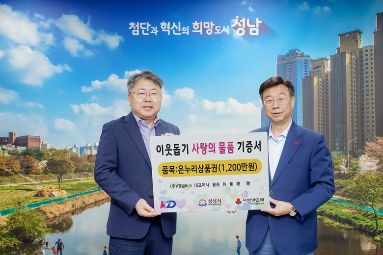성남시 분당구 야탑동 소재 성남시내버스㈜(대표이사 김윤태)는 1500만원 상당의 선물세트를, 구미동 소재 ㈜대원버스(대표이사 허상준)는 1200만원 상당의 온누리상품권을 성남시에 각각 전달했다. 기탁물품은 소년소녀가장, 독거노인 등 취약계층에게 전달될 예정이다.