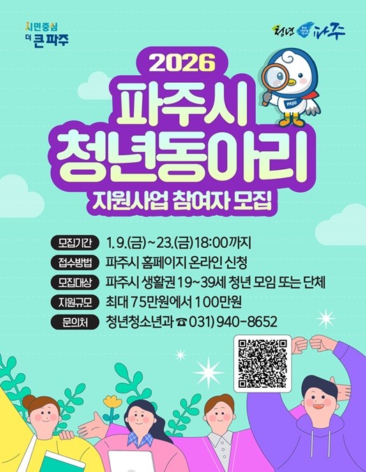 자세한 사항은 파주시청 누리집 공고문을 참고하거나 청년청소년과 청년정책팀(☎031-940-8652)으로 문의하면 된다.