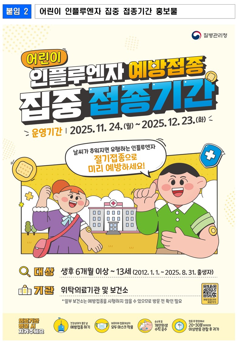 도는 현재 생후 6개월~13세 어린이, 임신부, 65세 이상 어르신*을 대상으로 2025~2026절기 인플루엔자 국가예방접종을 지원하고 있으며, 지역 접종률**은 목표치(어르신 81.5% 등)보다 낮은 접종률을 보이고 있어 도민의 안전하고 건강한 겨울나기를 위해 적극적인 예방접종 참여가 필요한 실정이다.
