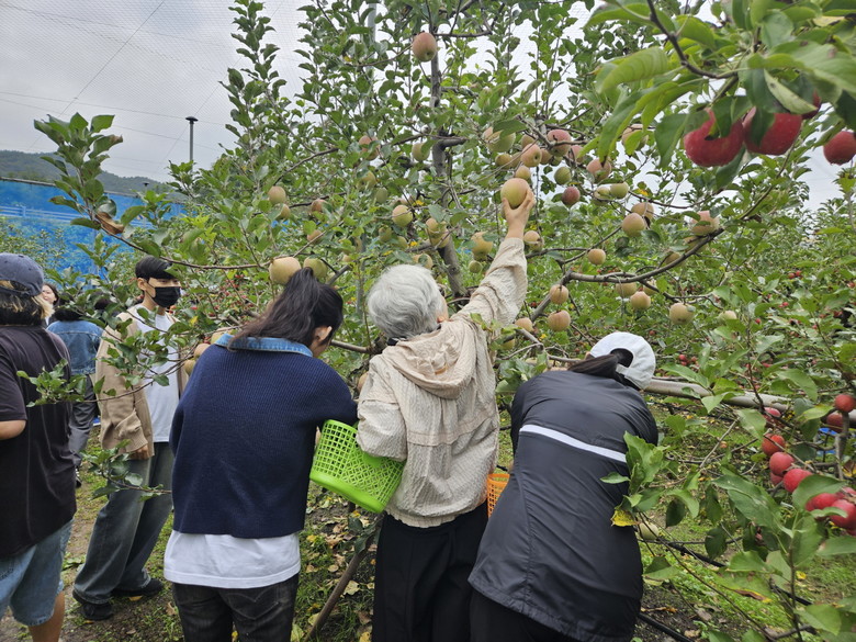 | ▲ 지난 18일 4구4색 프로그램으로 권선구에서 오감자극 과수체험에 참여한 1인가구 시민들이 수확하고 있다. |